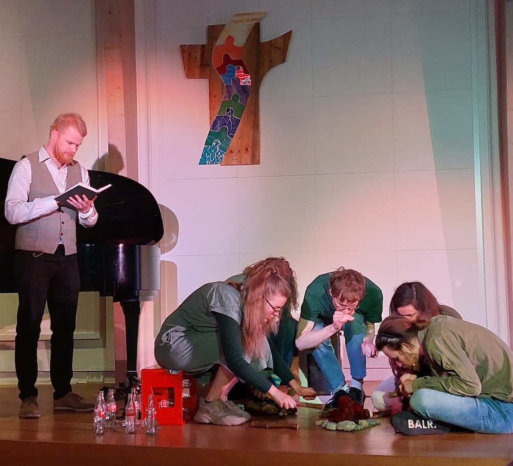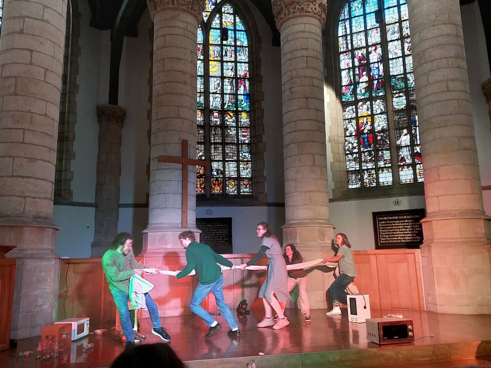 de vorm van een theaterviering, met liturgische elementen en samenzang. We zijn te