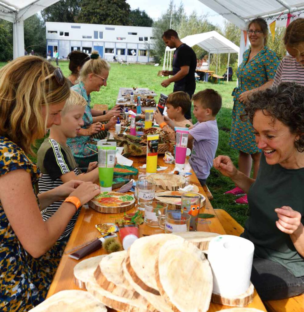 Samen vieren, samen delen, samen groeien! Dat is de basis van ons plan: aan de voorzijde ruimte voor maatschappelijke bewoning, aan de achterzijde een creatieve werkplaats en een stilteplek. Tussenin leeft de natuur — op het terrein én op het groene eiland — als hart van verdieping, inspiratie en ontmoeting.